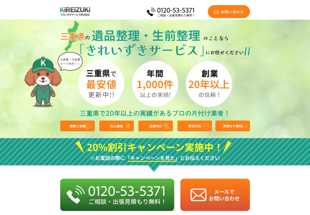 2024年9月18日 / 最終更新日時 : 2024年11月3日 sayuri sakana ウェブ 地方の遺品整理のLPをデザインしました 初めてLPのデザインを任せていただきました!クライアント様には大変よく作っていただけたと満足していただけてとても嬉しかったです。色合いや希望のデザインを聞き、ワンちゃんの微修正以外は一発で納品できました。 緑とオレンジの […]